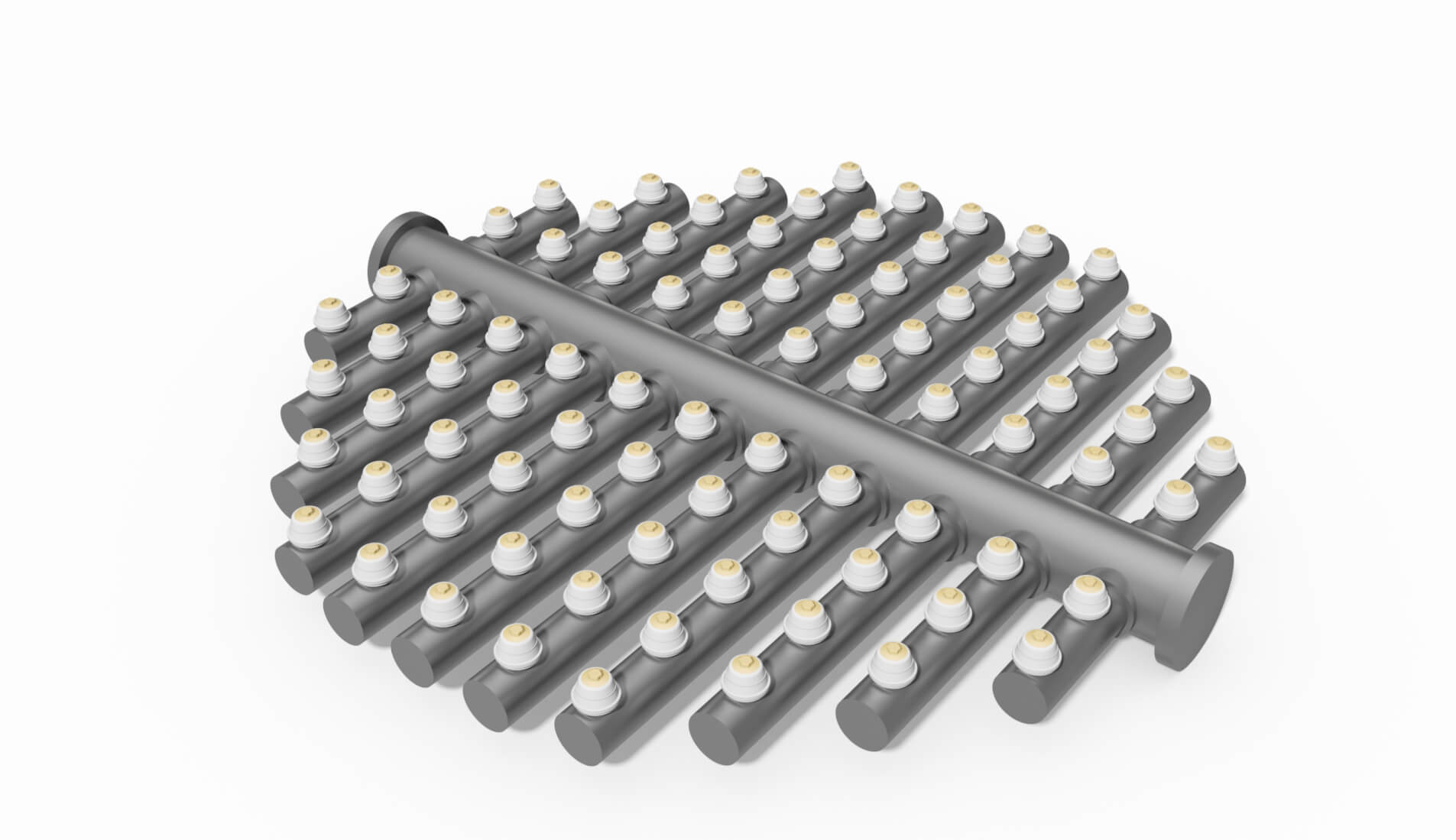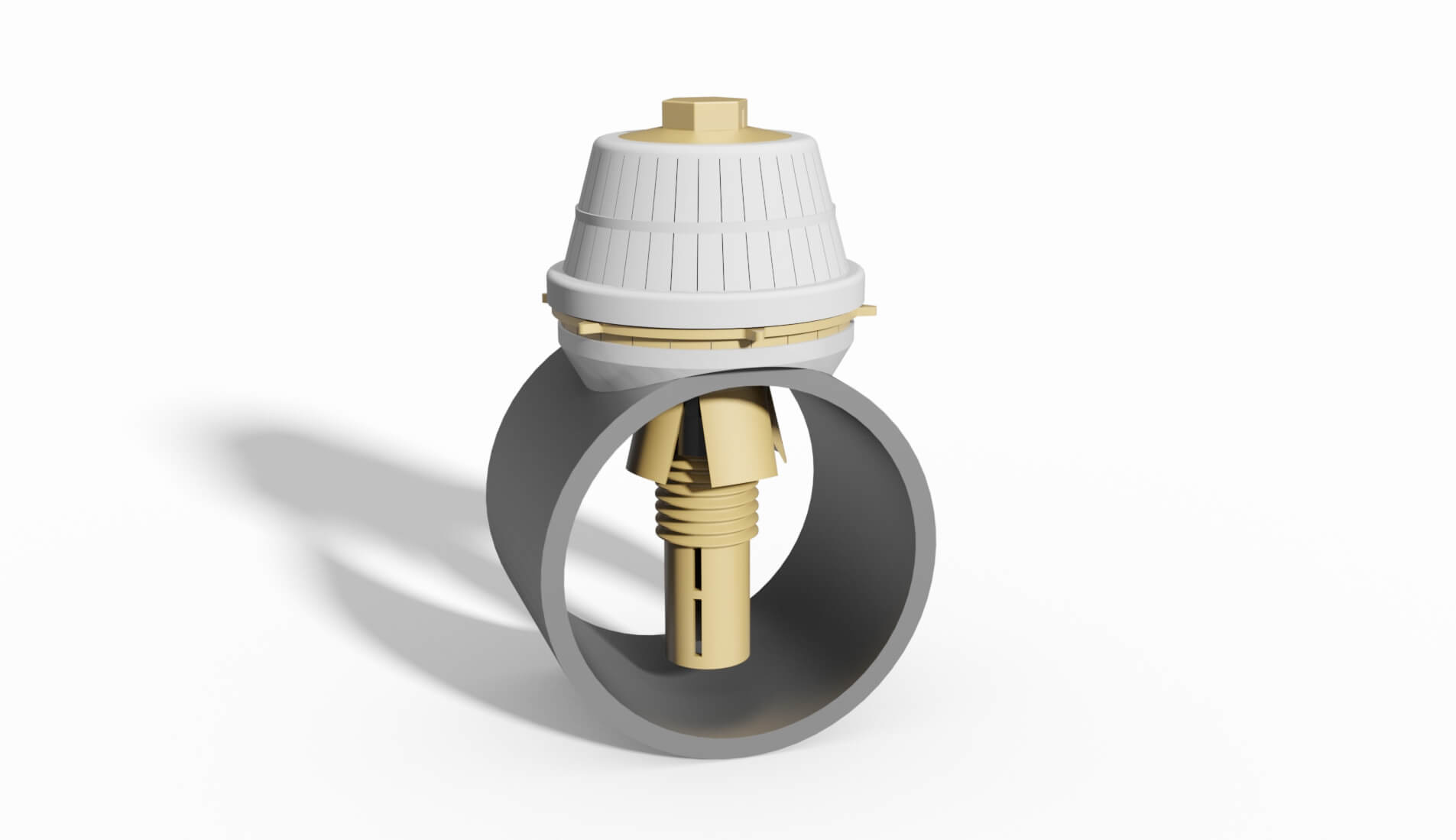 Filterdüse auf Basis des Typs KSP zur Verwendung mit einem Rohrsystem. Der elastische Rohrsattel kann geringe unregelmäßigkeiten des Drainagerohrs ausgleichen. Zur Montage wird die Düse durch den Rohrsattel in das vorbereitete Drainagerohr gesteckt und mit Hilfe des Spreizdübels fixiert.