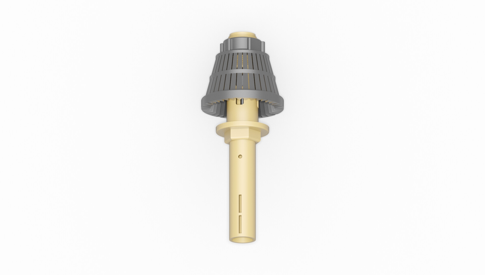 Das Luftpolsterrohr wird von unterhalb des Düsenbodens eingesteckt und durch aufschrauben des Schlitzteils in Position gehalten. Diese spezielle Montageart kann geringe Schiefstellungen des Düsenbodens ausgleichen.