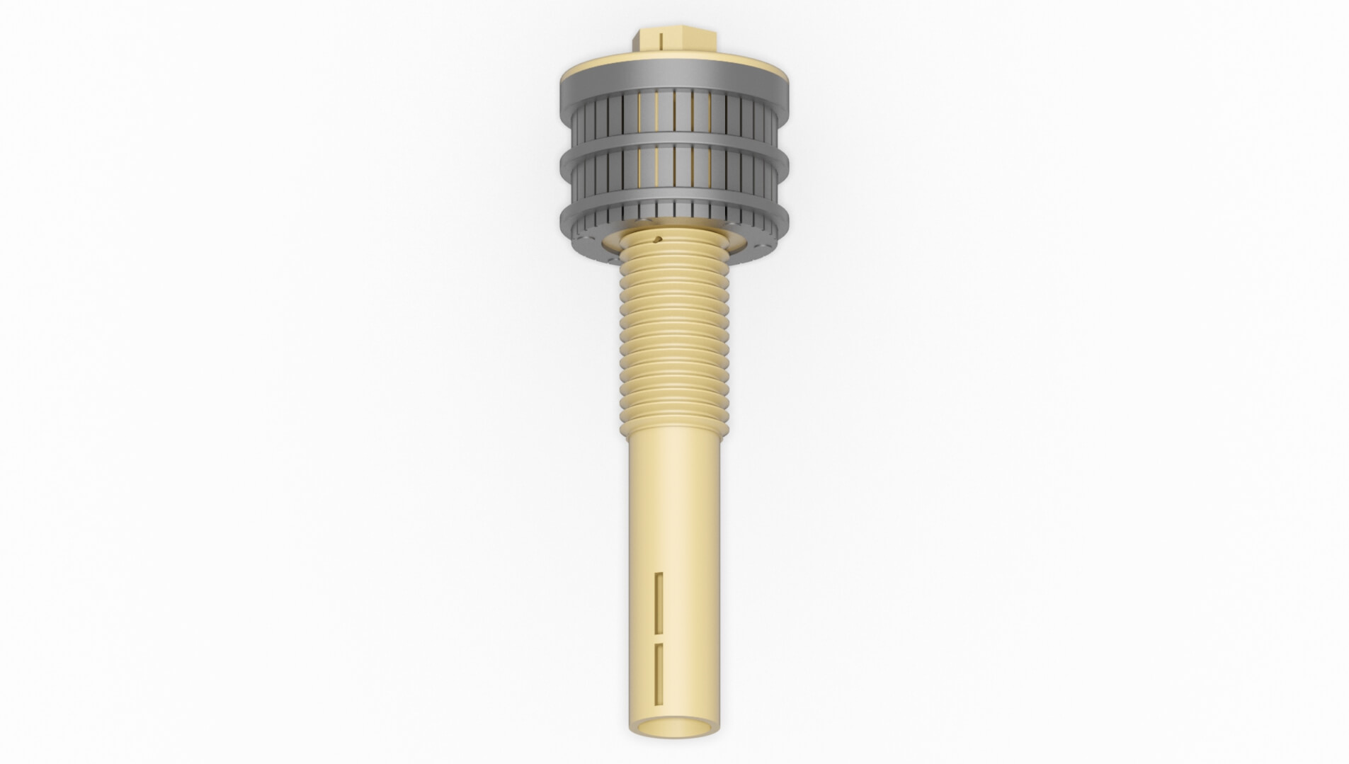 Düse mit zylindrisch geformten Schlitzteil welche häufig in großen Sandfilteranlagen verwendet wird. Durch die angebrachte Restentleerung werden Toträume am Boden des Filterbeckens vermieden. Die Anordnung der Schlitze sorgt für ein horizontales Sprüverhalten des Rückspülmediums.