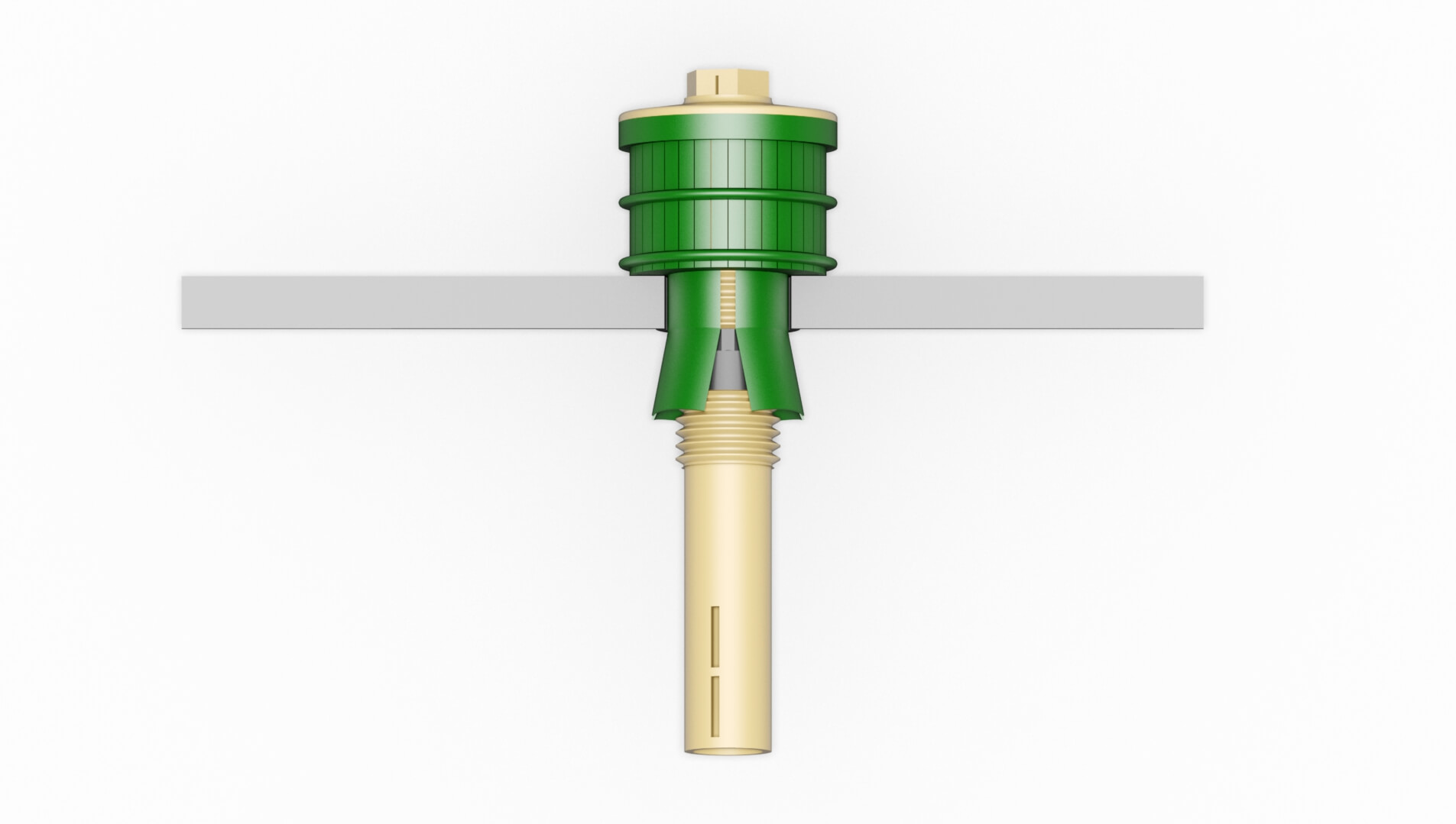 Filterdüse auf Basis des Typs D mit Spreizdübel zur einfachen Montage von Oberhalb des Düsenbodens. Der Dübel erlaubt eine befestigung in Düsenböden mit einer Stärke von bis zu 45mm. Bei Rückspülung mit Luft empfehlen wir die Verwendung von Dichtringen Typ DG50.